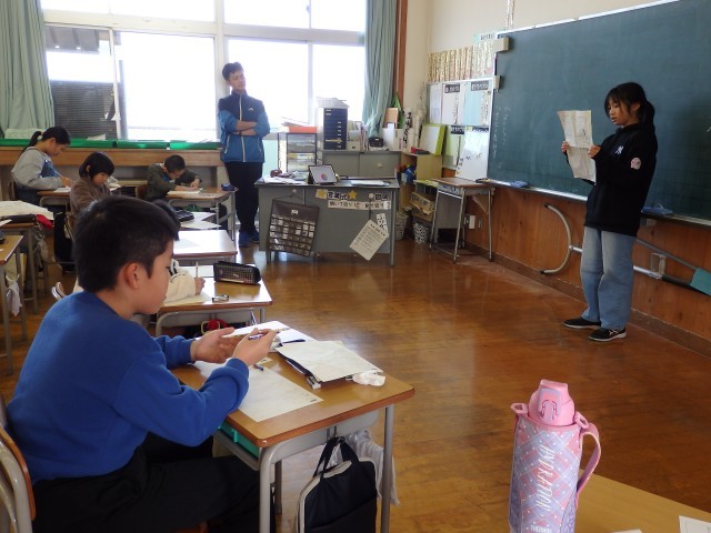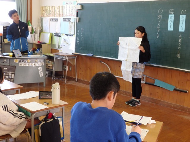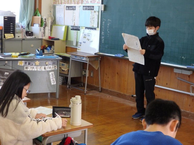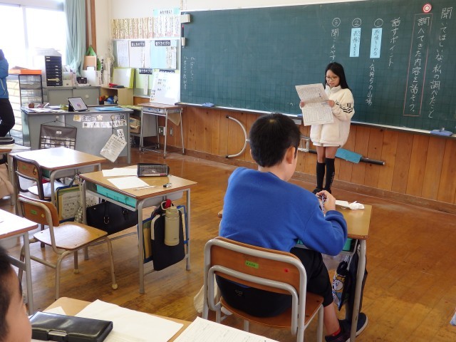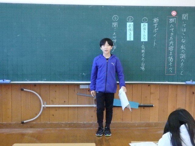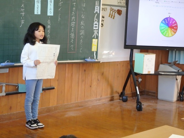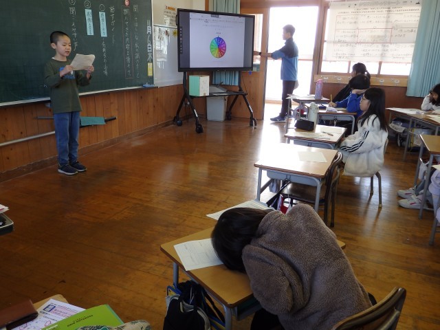 4年生の2時間目は国語の授業でした。「調べたことを発表しよう」の学習です。これまで和と洋の違いやよさについて自分でテーマを決めて調べたり、相手に話を聞いてもらうためのポイントについて学習してきましたが、それらの総まとめの学習です。1人1人が調べたことをみんなの前で発表していきました。自分の経験から感じたことを気持ちを込めて話したり、原稿を見ないで話したりする子がたくさんいました。1人の発表が終わるごとに感想や質問する人がたくさんいました。