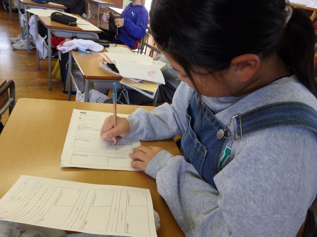 4年生の3時間目は学活の授業でした。学習発表会を終えての振り返りを行いました。また、練習や本番を通してのクラスの仲間の頑張りやよかったところをカードに書いていました。クラスの仲間同士でお互いをたたえ合うこと、また、他の人から認められることで自分に自信が持てるようになりますね。居心地のいい学級づくりにもなります。
