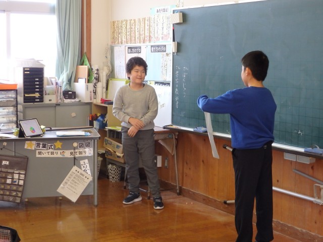 昨日の4年生の5時間目は総合の授業でした。学習発表会の準備と練習をしていました。自分たちで考えて意見を出し合い、小道具を準備したり練習を進めたりしていました。