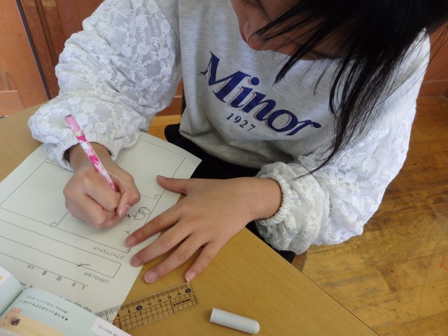 4年生の1時間目は国語の授業でした。「暮らしの中の和と洋」のまとめの学習として「和と洋新聞」を1人1人作りましたが、その発表のための準備や練習をしていました。新聞の内容について、みんなに発表することを箇条書きで書き出していきます。先生に見てもらい、OKをもらったら発表の練習です。多目的室で2人の子がお互いの発表を聞かせ合っていましたが、いったん教室へ行って戻ってみると部屋の中を早足で往復しながら原稿を読んでいました。「早口にならずにゆっくり読む」ための練習を考えたそうです。