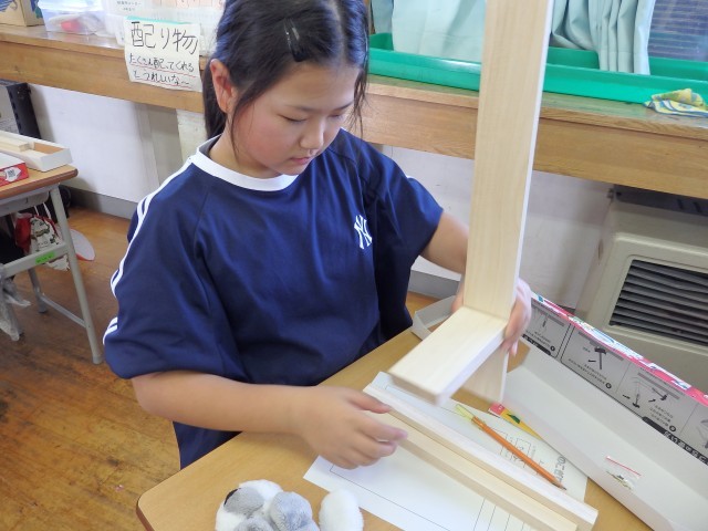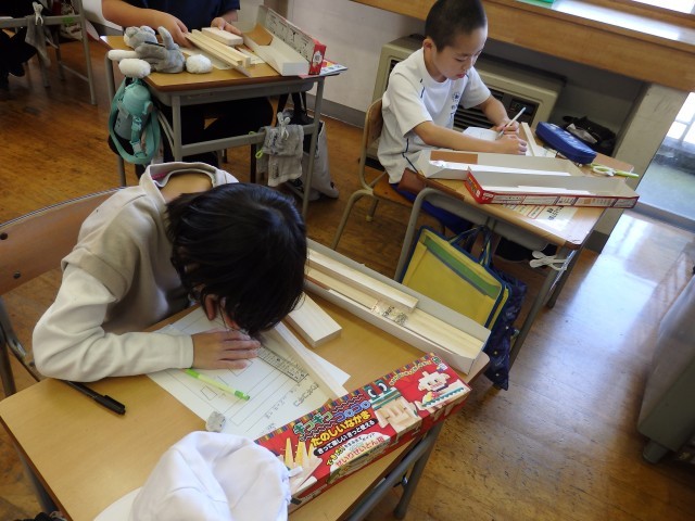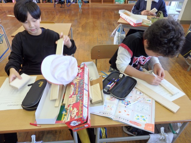 4年生の5時間目は図工の授業でした。「のこぎりぎこぎこ」という学習です。長さや太さが違ういろいろな種類の木材を使って物づくりです。まずは何を作るか考えました。木材を実際に組み合わせながら、何を作ろうか一生懸命考えていました。作るものが決まったら、自分のイメージを描きました。犬、ライオン、自動車、棚などを考えていました。