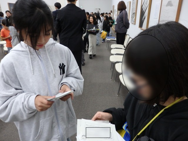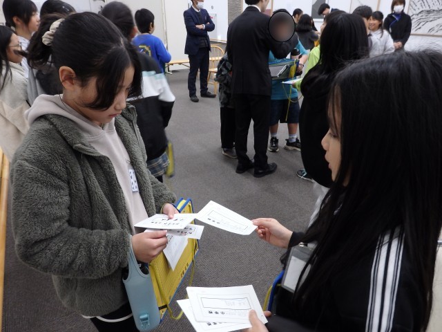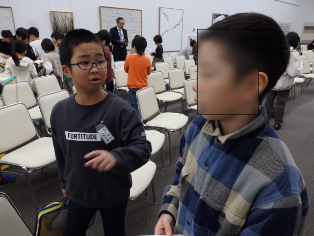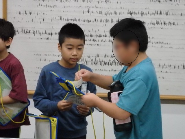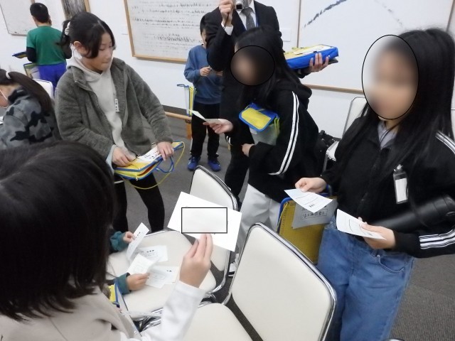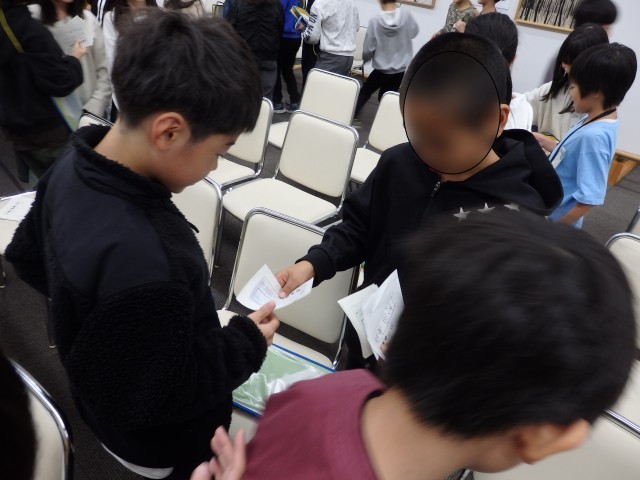 3校交流会、前半が終わって休憩時間です。休憩時間には自由に他校の子たちと名刺交換をしたりしながらお話をしました。準備してきた15枚の名刺は全部渡し終わったでしょうか。
