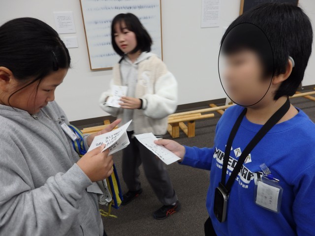 交流会では1曲演奏が終わるごとに席替えをします。席替えをしたら、近くになった五十沢小、城内小の人と手作りの名刺交換です。名前と自分が好きなものが書かれています。少しずつ慣れてきて、笑顔が見れたり、名刺を見ながら話をしたりしている姿が出てきました。
