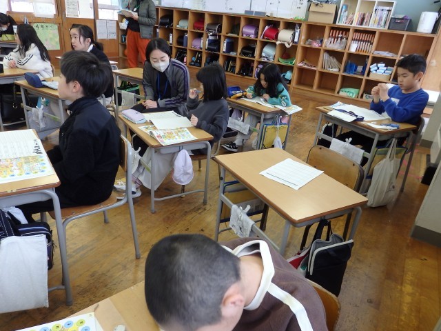 4年生の時間目は書写の授業でした。保護者でもある地域の方から書き初めの指導をしていただきました。講師の先生から朱書きで直してもらった作品を見ながら何度も何度も練習していました。ご指導ありがとうございました。