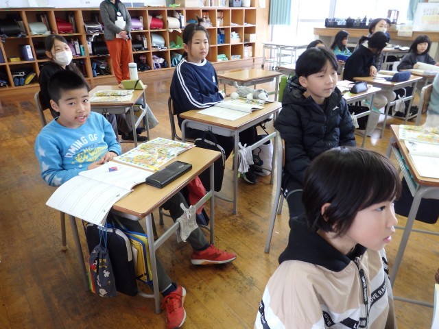 4年生の4時間目は国語の授業でした。「ごんぎつね」の学習です。第5場面の「ごんが栗や松茸を兵十の家に置いていったのに、兵十は神様が置いていったと思っている」という場面まで読んだところで、「ごんはこの先、いたずらを続けるのか、続けないのか」を考えました。続ける派、続けない派、どちらとも言えない派の3つに意見が分かれました。物語で書かれている文を理由として考え、発表していきました。
