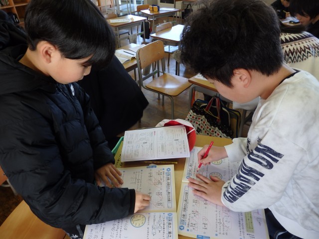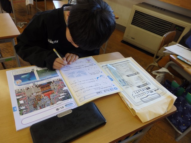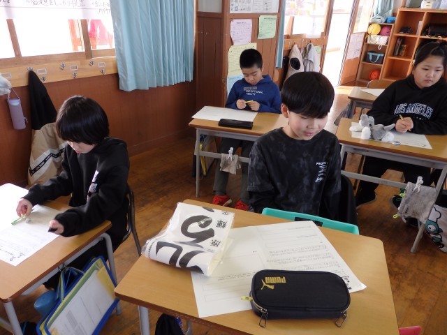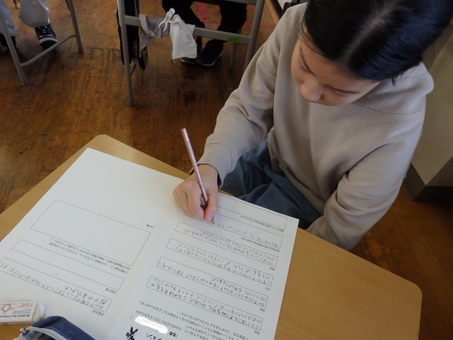 4年生は早くも宿題に着手したり、2学期の振り返りをしたりしていました。宿題をやりながら分からないところを教え合っていました。2学期の振り返りでは、各教科や総合・道徳の授業で、学校生活の中で、各行事で頑張ったことを書いていました。枠の中にビッシリと書き込んでいる子がたくさんいました。