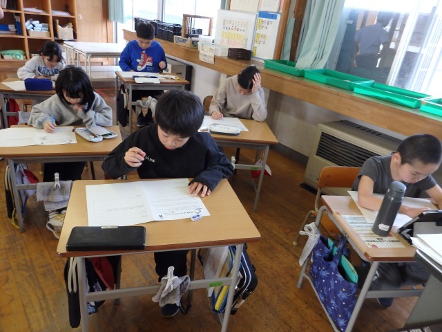4年生の5時間目は書写の授業でした。書き初めの練習です。先日、地域の書き初めの先生から朱書きで指導いただいた作品を見て、教えていただいたことを思い出してから練習を始めました。担当の先生も「すごい変わってきたね。上手になってるよ」と褒めていました。書写は頑張って練習すればするほど上手に書けるようになると思います。冬休みの練習を頑張っていい作品を書いてほしいです。