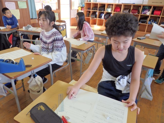 4年生の5時間目は音楽の授業でした。前半は「ハレルヤホッホー」という歌を元気に歌いました。途中で2つに分かれて、それぞれが別な歌詞で歌います。あまりに元気すぎて「運動会の応援歌じゃないんだから」と先生から言われるほどでした。後半はリコーダーで「オーラリー」という曲の演奏をしました。歌を歌ったときの元気のよさから一変、優しい音色で演奏できました。