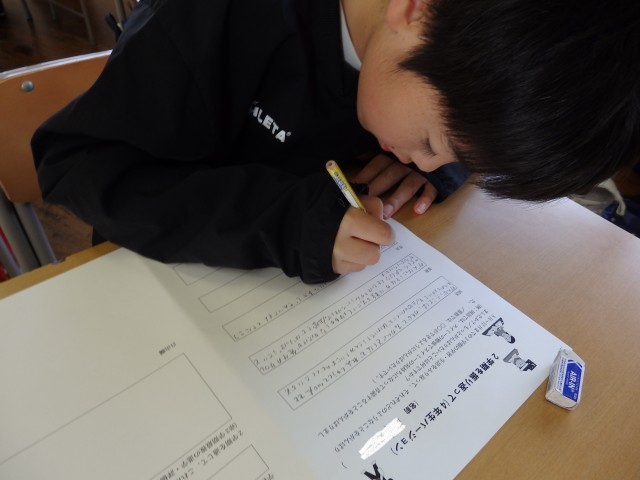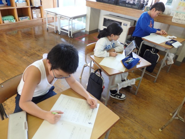 4年生の1時間目は国語の授業でした。「ごんぎつね」の学習です。「空が晴れていて、モズの声がキンキン響いていました」という文を取り上げ、【登場人物に関係ない文がなぜ書かれているのか】を考えました。物語の中にある他の【人物に関係ない文】を取り上げ、『情景描写』ということばを学びました。また、その漢字からどんな意味なのかを予想しました。『情景描写』の意味について意見交換しながら、それらの文が物語の中ではどんな意味をもっているのかまで考えた発言が出されていました。