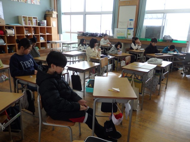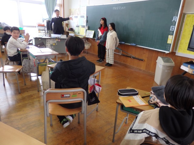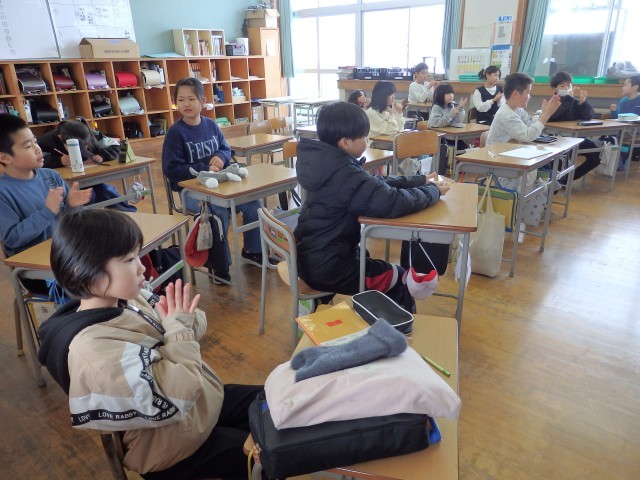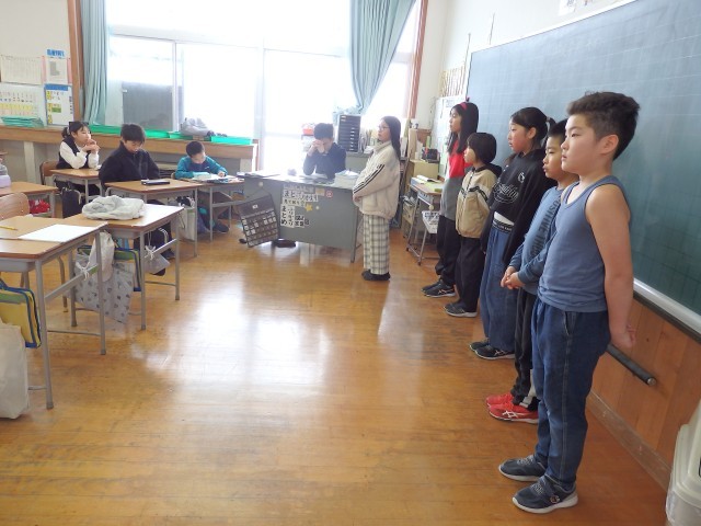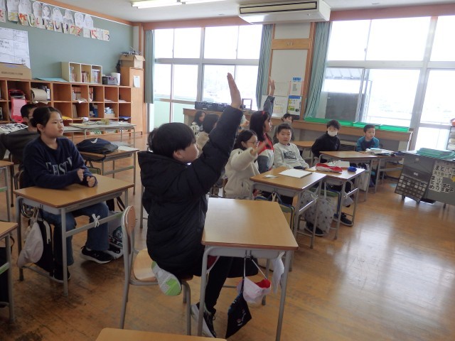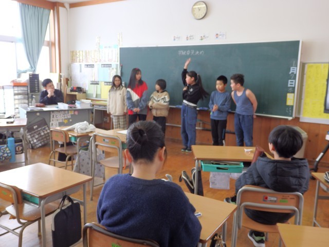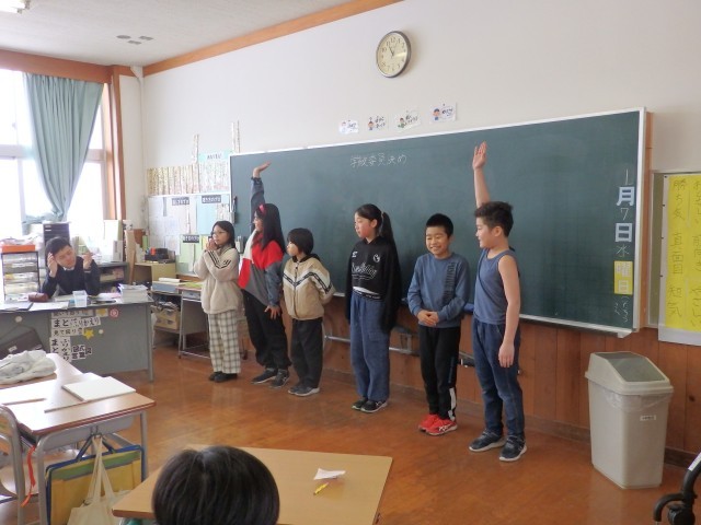 4年生の3時間目です。学級委員を選出しました。立候補者6人が前に出て、クラスの人たちからの「こんなときどうしますか?」などの質問に答えたり、「こんなクラスにしていきます」と決意を発表したりしていました。中学校での生徒会役員選挙で行う立ち会い演説会を思い出しました。質問や決意発表が終わったら投票によって2名の学級委員が決まり、みんなからの拍手を受けていました。高学年になるための準備期間の3学期です。学級委員を中心にしっかりまとまり、よりよいクラスを創り上げてほしいです。