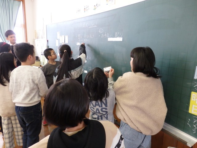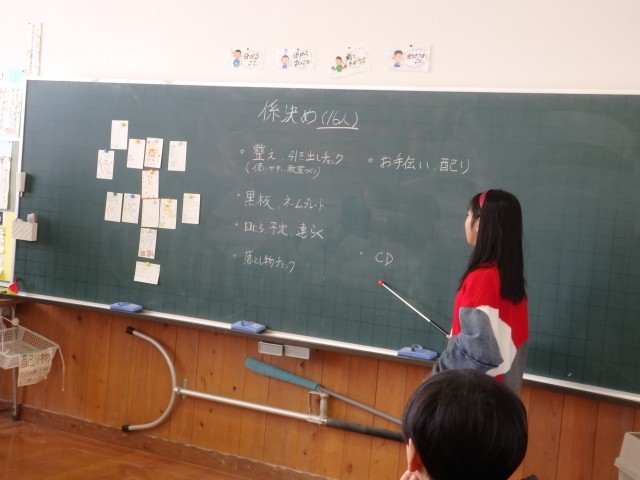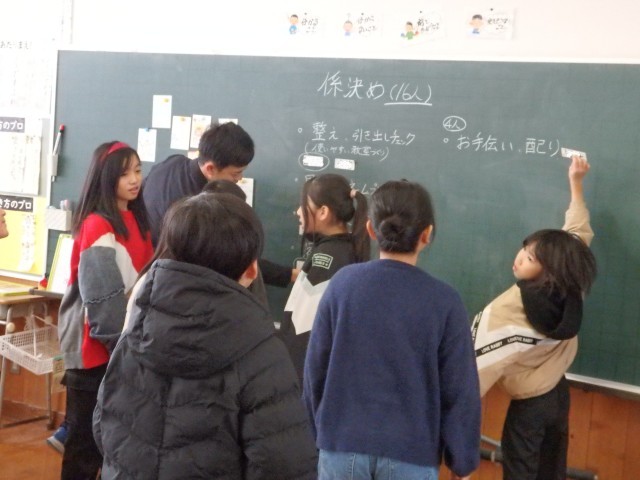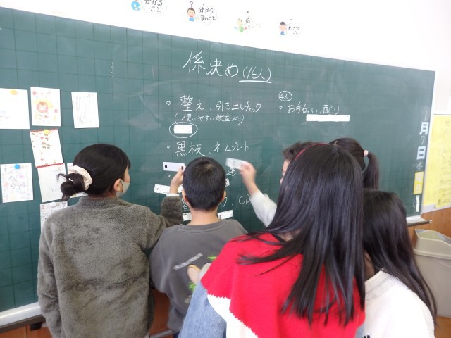 4年生の1時間目です。係活動について話し合っていました。教室でクラスのみんなが気持ちよく過ごせるようにするには、どんな係が必要なのか考えを出し合っていきました。5つの係が決まったところで役割分担です。自分がやりたい係のところへネームプレートを貼り、希望が多かったところは話し合いをして決定します。係が決まって最後は、ポスター書きをしました。