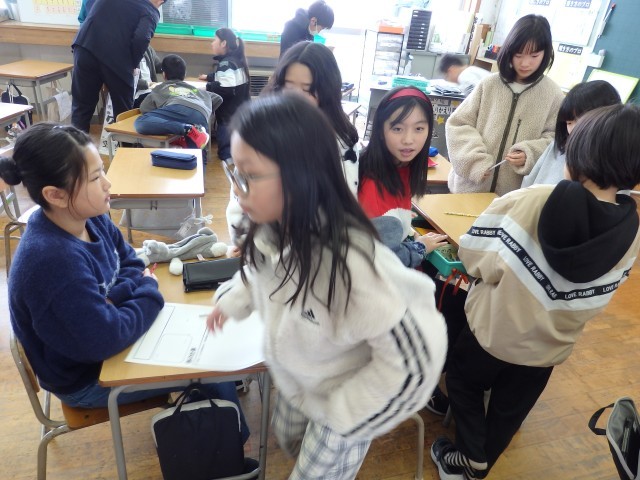 4年生の5時間目は学活の授業でした。「お楽しみ会」についての話し合いです。学級委員の2人が司会をして話し合いを進めていました。野球、ドッヂボール、バスケ、バレーなどの球技系やきつね狩り、鬼ごっこなどの定番のもの、さらには将棋、きもだめし、人狼ゲーム、百人一首といった案も出ていました。多数決で2つに絞り、チーム決めは電子黒板を使ってくじ引きで。ワクワクドキドキの笑顔でくじのゆくえを見守る子どもたちでした。