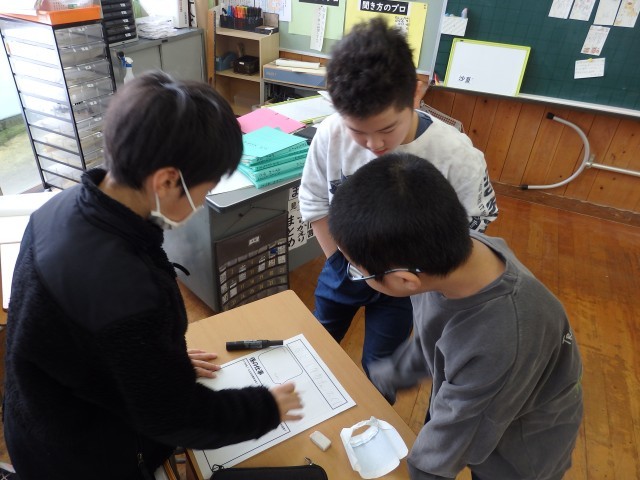 5年生の3時間目は総合の授業でした。12月12日に実施する埼玉県の豊里小学校との「自然の恵み交換会」で発表する打ち合わせをグループごとでしていました。酒、山、野菜、雪などについて調べたことをまとめた色画用紙を見ながら、誰がどこの部分を伝えるのかなどについて話し合いました。南魚沼市のよさを埼玉の人たちにしっかり伝えてほしいです。
