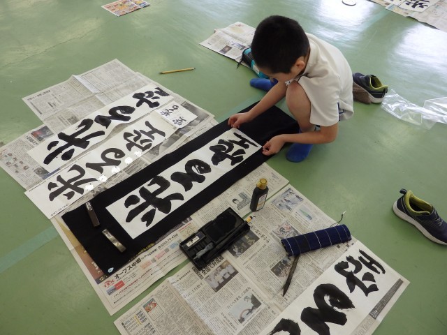 4年生の5時間目は書写の授業でした。冬休みの課題にもなる書き初めの練習をしました。「光る空」です。教室ではなく、書き初め大会で使用する3階の多目的室で行いました。どの子も真剣な表情で集中して取り組んでいました。1枚書き終えるごとに「はぁ~」とほっと一息つくほどでした。