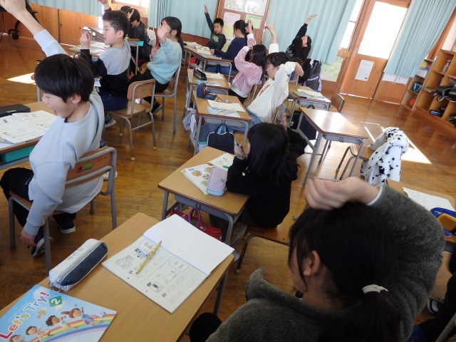 4年生の2時間目は国際科の授業でした。まずはALTの先生とアルファベットの音読みの学習です。今日は「ue」の読み方についてジェスチャーをしながら練習しました。その後、アルファベットの小文字について学習しました。「ABCの歌」を歌ったり、小文字で書かれたアルファベットを見ながらALTの先生の後に続いて名前読みを発音する練習をしました。口をしっかり開けて発音していますね。