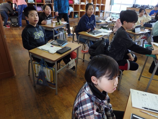 4年生の3時間目は算数の授業でした。図形の学習のまとめで、教科書の「できるようになったこと」などの問題に取り組んでいました。小グループで机を合わせて、分からないところを教え合ったりしながら取り組んでいました。