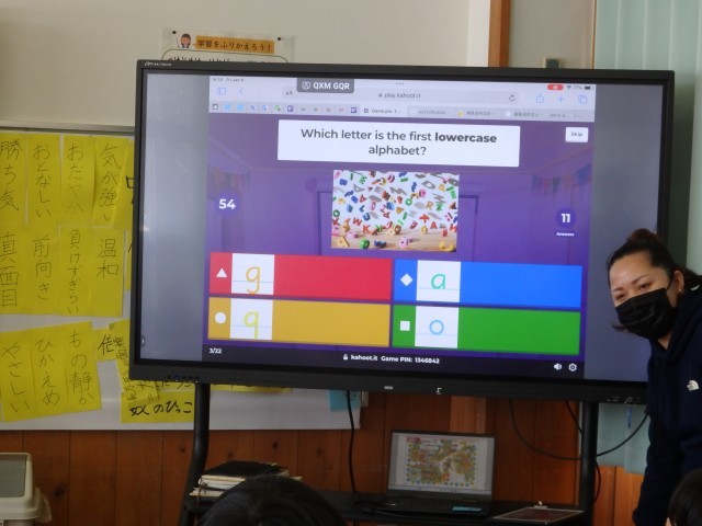 4年生の5時間目は国際科の授業でした。まずはALTの先生とアルファベットを組み合わせた「er」の読み方について学習しました。player、runner、driverなどでよく使われる音ですね。その後、iPadのクイズアプリ「カフート」を使って、2学期の最後に学習していたアルファベットの小文字の復習をしました。「nの次の文字は?」「10番目の文字は?」などの問題に早く正確に答えようと一生懸命でした。正解してガッツポーズ、間違えて頭を抱え込む子がたくさんいました。