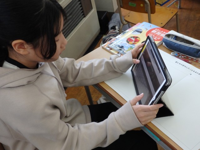 4年生の1時間目は社会の授業でした。「地域で受け継がれてきたもの」の学習です。インターネットで「昔から受け継がれてきた歴史ある建物」について調べ、新聞の形でまとめていました。長谷川邸やもみじ園、六万騎城、坂戸城跡などについて調べていました。