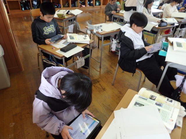 4年生の1時間目は社会の授業でした。「昔と今の新潟県」の学習です。教科書を読み込んだり、インターネットを使ったりして「新潟県の暮らし 今と昔の違い」について調べていました。調べて分かったことはiPadの「キャンバ」というアプリやプリントにまとめていきました。「今と昔の家電の違い」や「お店の違い」、「南魚沼市西部の開田事業」などについて調べていました。