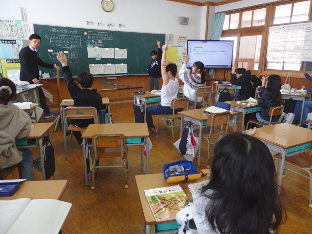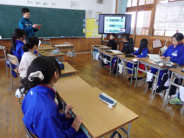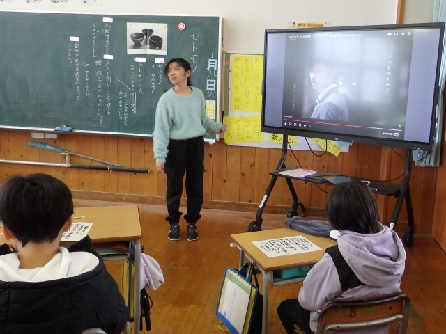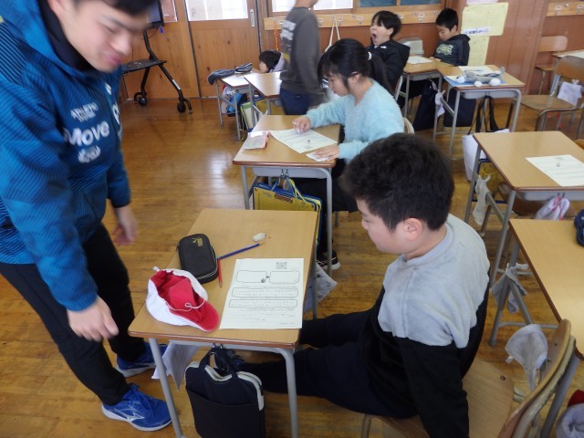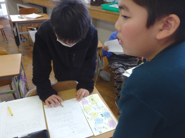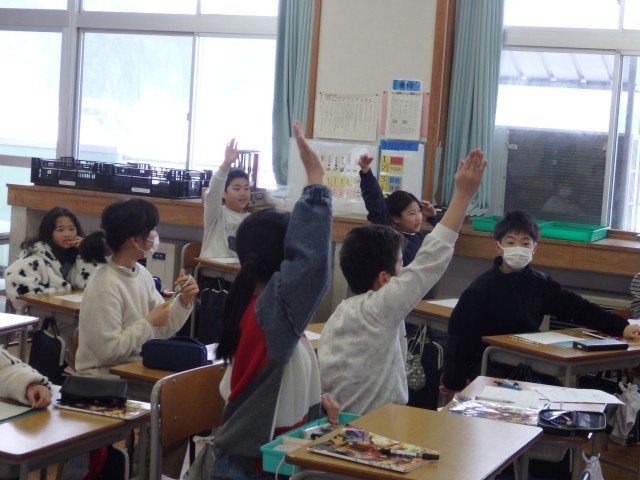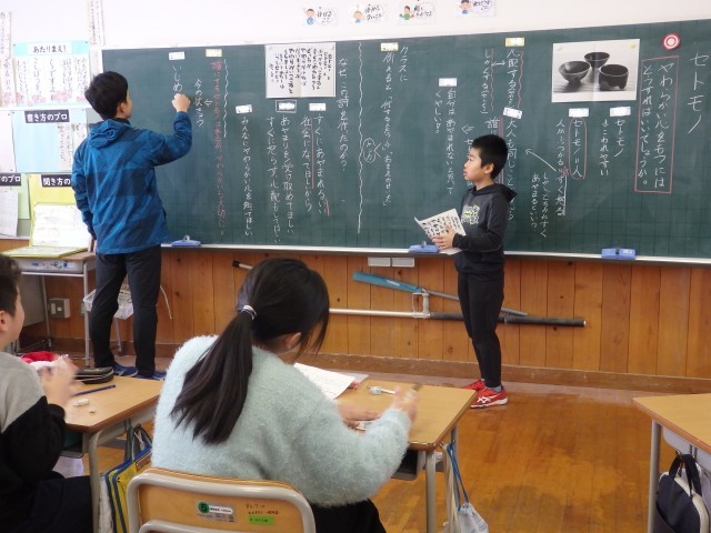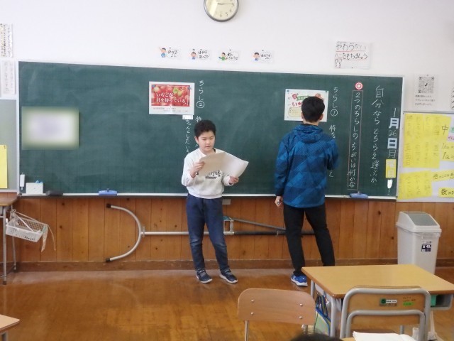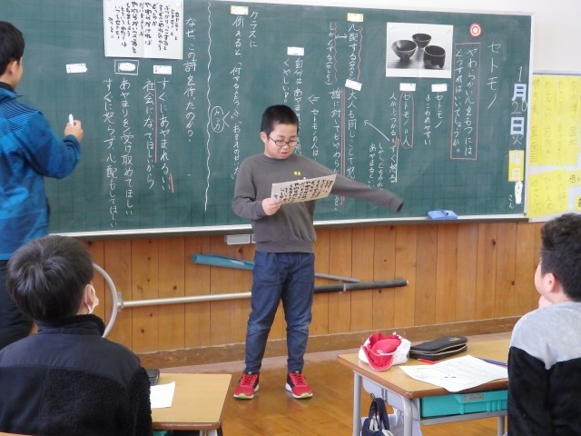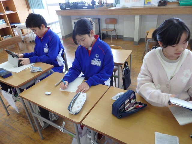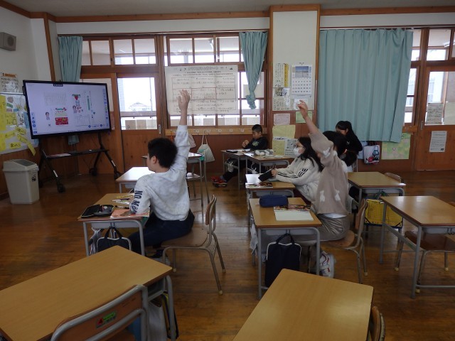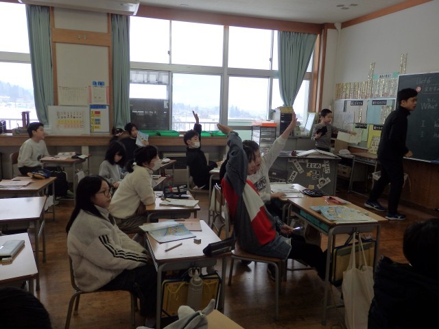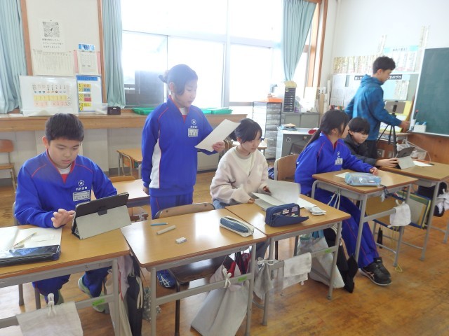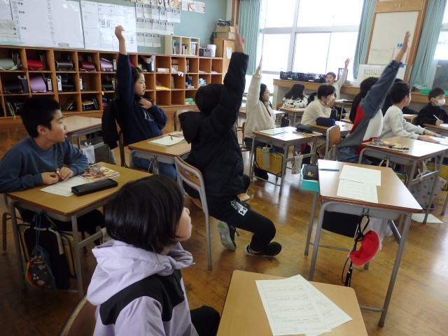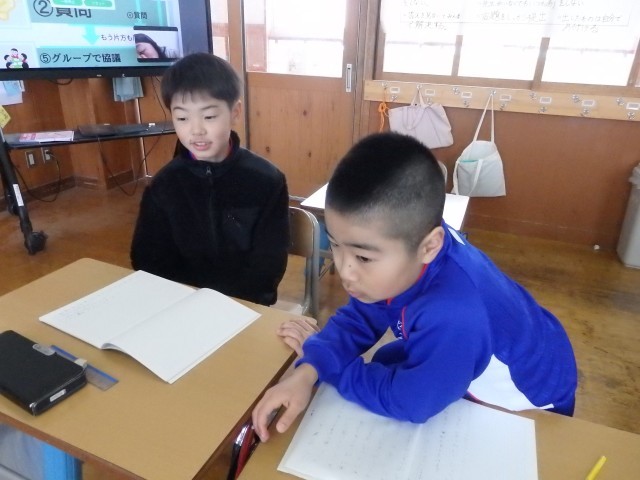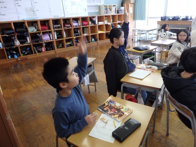 4年生の3時間目です。学級委員を選出しました。立候補者6人が前に出て、クラスの人たちからの「こんなときどうしますか?」などの質問に答えたり、「こんなクラスにしていきます」と決意を発表したりしていました。中学校での生徒会役員選挙で行う立ち会い演説会を思い出しました。質問や決意発表が終わったら投票によって2名の学級委員が決まり、みんなからの拍手を受けていました。高学年になるための準備期間の3学期です。学級委員を中心にしっかりまとまり、よりよいクラスを創り上げてほしいです。