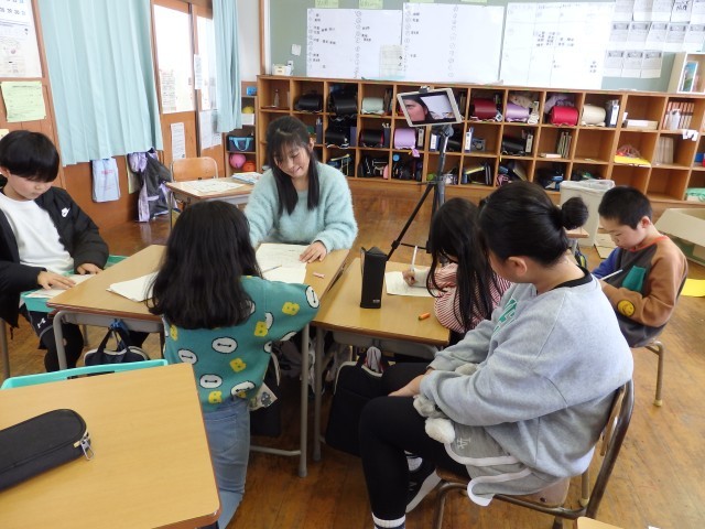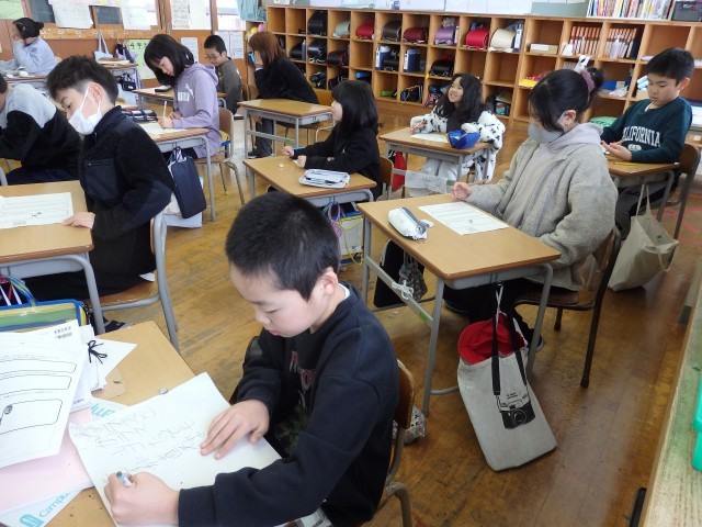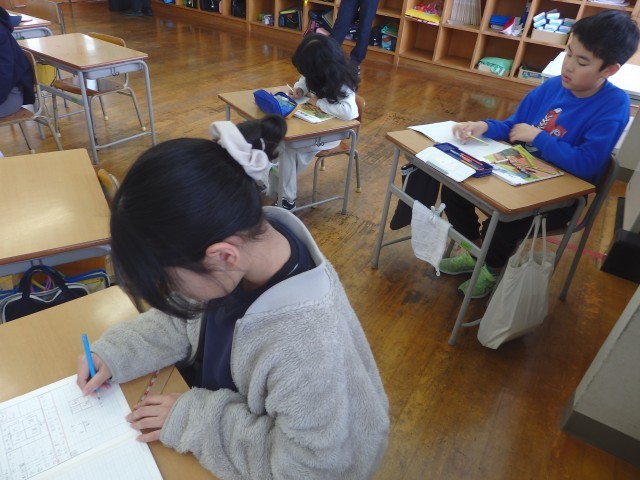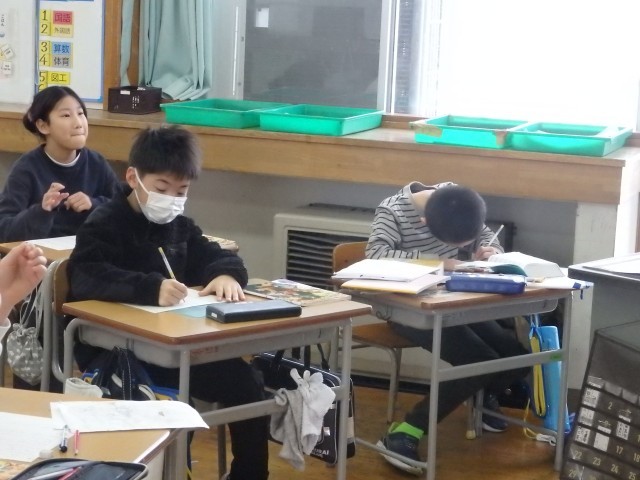 4年生は早くも宿題に着手したり、2学期の振り返りをしたりしていました。宿題をやりながら分からないところを教え合っていました。2学期の振り返りでは、各教科や総合・道徳の授業で、学校生活の中で、各行事で頑張ったことを書いていました。枠の中にビッシリと書き込んでいる子がたくさんいました。