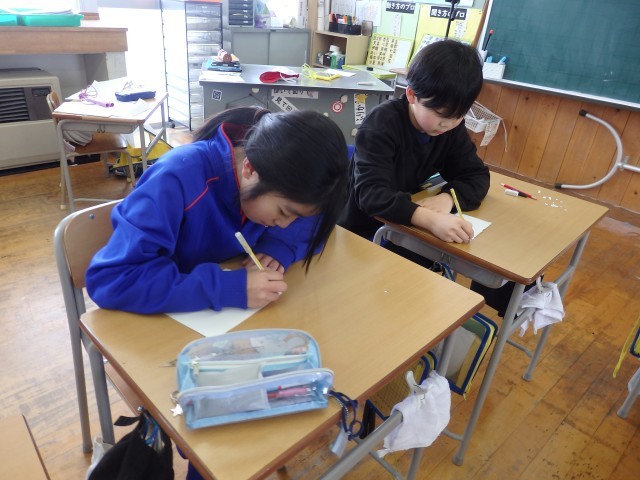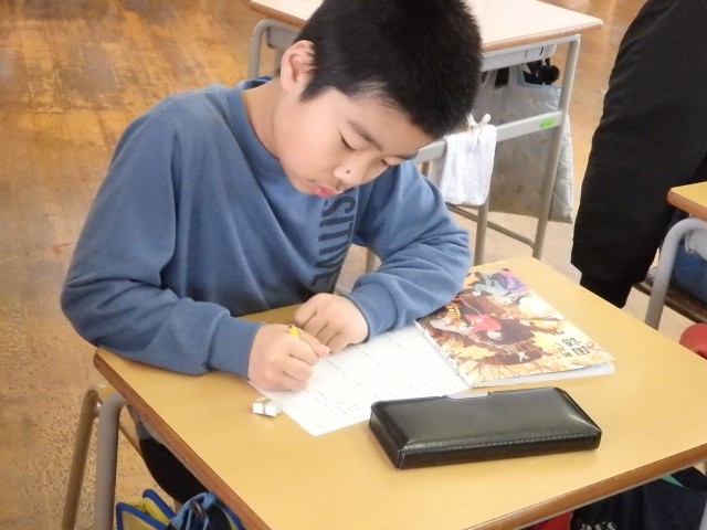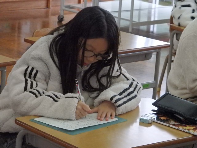 4年生の5時間目は書写の授業でした。書き初めの練習です。先日、地域の書き初めの先生から朱書きで指導いただいた作品を見て、教えていただいたことを思い出してから練習を始めました。担当の先生も「すごい変わってきたね。上手になってるよ」と褒めていました。書写は頑張って練習すればするほど上手に書けるようになると思います。冬休みの練習を頑張っていい作品を書いてほしいです。
