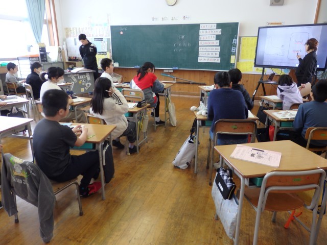 4年生の2時間目は国際科の授業でした。まずはALTの先生とアルファベットの音読みの学習です。今日は「ue」の読み方についてジェスチャーをしながら練習しました。その後、アルファベットの小文字について学習しました。「ABCの歌」を歌ったり、小文字で書かれたアルファベットを見ながらALTの先生の後に続いて名前読みを発音する練習をしました。口をしっかり開けて発音していますね。