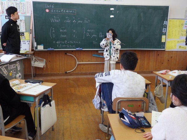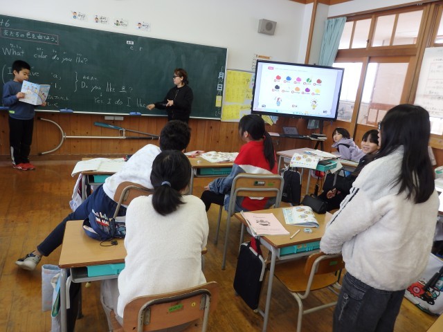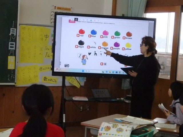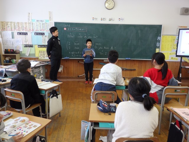 4年生の2時間目は国際科の授業でした。ALTの先生と「ar」の読み方を学習した後、アルファベットの小文字について学習しました。自分が好きな色は何色か1人ずつクイズにしました。ヒントとして「I have ‘e’.」のように、その色の英語のつづりに含まれているアルファベットを教えます。「ほとんどの単語にeってあるね」という声が聞こえてきました。blue, yellow, red, white・・・確かに。