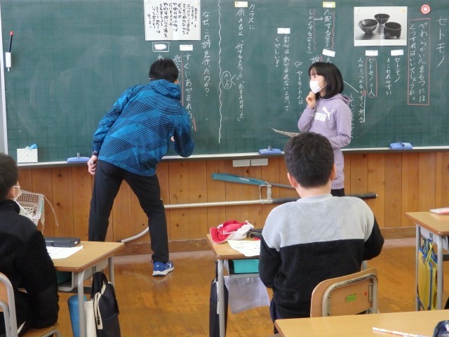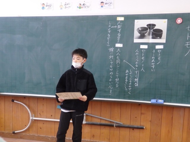 4年生の1時間目は道徳の授業でした。相田みつをさんの「セトモノ」という詩を読んだり、その詩を扱ったACのCM動画を視聴したりして「硬い心と柔らかい心」について考えました。「硬い心」「柔らかい心」とはどういうことなのか、柔らかい心をもつためにはどうしたらよいのかなどについて考えました。最後に、あと数ヶ月で高学年になる自分を見つめ直し、課題や改善点は何か考えました。また、詩を基に「セトモノ」を「ガラス」に変えて、オリジナルの詩を作っている子がいました。なかなかいい詩でした。