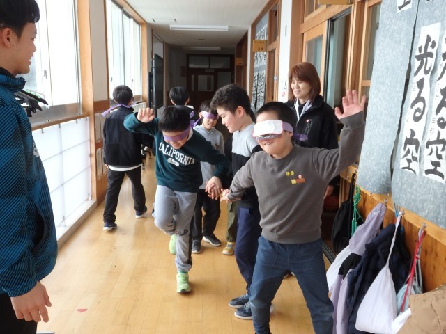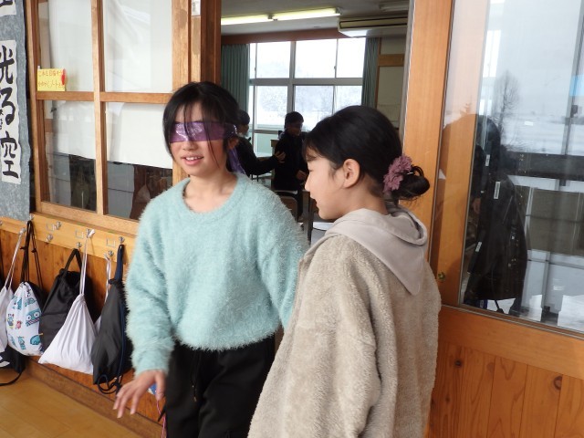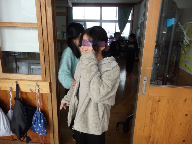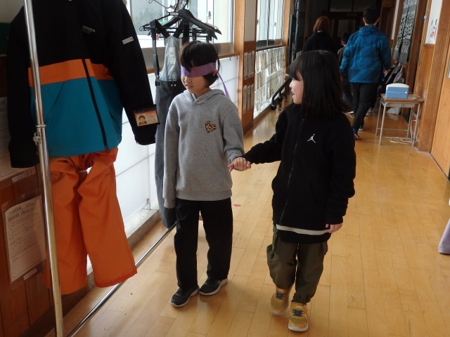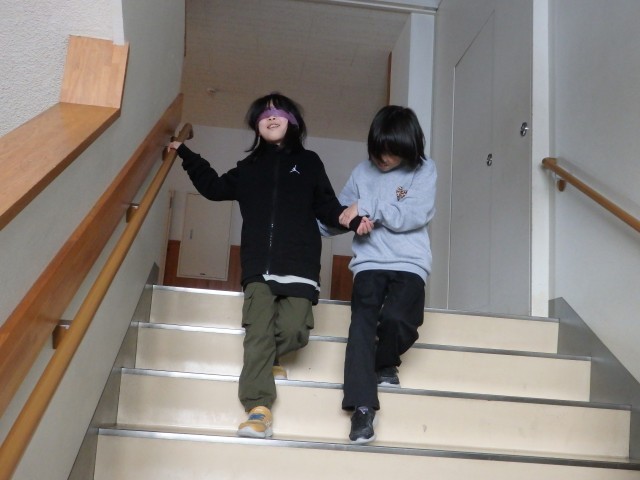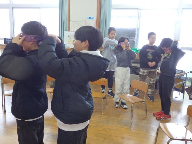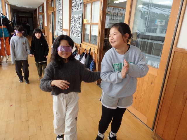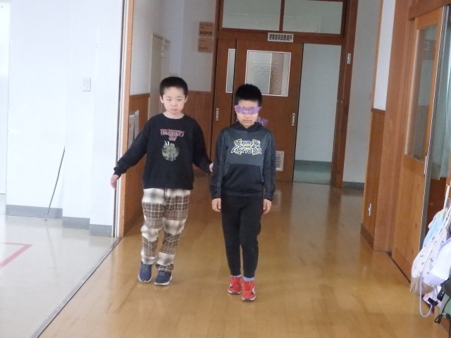 4年生の6時間目は学活の授業でした。ソーシャルスキルトレーニングとして「ブラインドウォーク」を行いました。目隠しをして何も見えないペアの子が不安にならないように、手を添えて、進む方向を丁寧に伝えながら目的地へ誘導します。決して無理矢理、引っ張っていってはいけません。廊下や階段を使って目的地へ向かいますので、一歩一歩慎重に歩を進められるように誘導していました。これも1時間目の道徳で考えた「柔らかい心」ですね。
