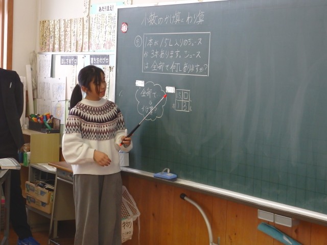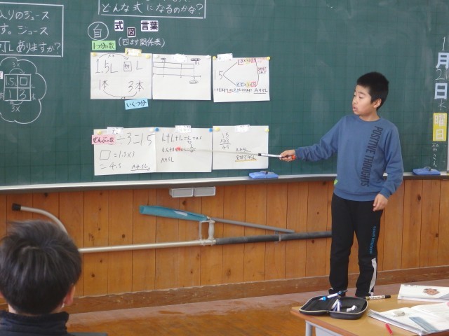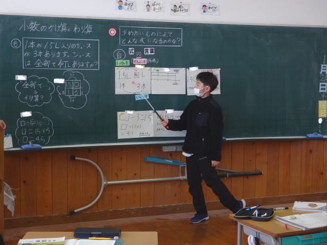 4年生の3時間目は算数の授業でした。他校の先生と市の指導主事が参観しての授業でした。「小数のかけ算・割り算」の学習です。「1.5Lのジュースが3本あります。ジュースは全部で何Lですか」という問題に取り組みました。数直線や4マス関係表を使ってどう計算するか考えたり、1.5を1と0.5に分けて計算したりして答えを求めました。さらに「同じ重さの板が6枚、重さは全部で5.1kgです。1枚の重さは何gですか」という問題にも取り組みました。体調不良で欠席の子もオンラインで授業に参加していました。