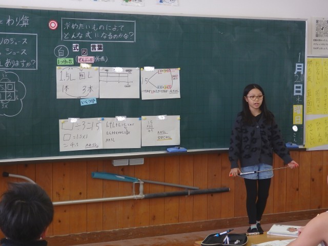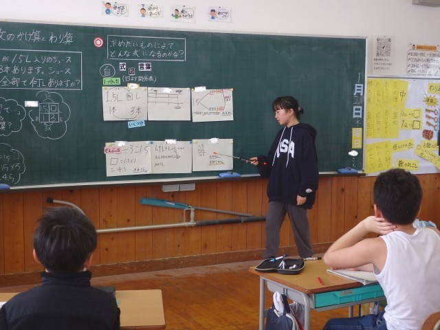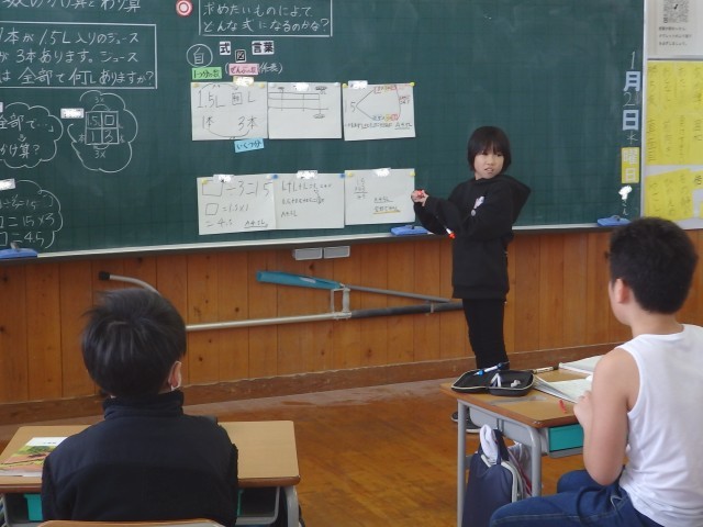 4年生の3時間目は算数の授業でした。「□Lのジュースを3本のビンに同じように分けると、1本分は何Lになりますか」という問題について、まずはどういう計算をしたらよいのか、□に数を入れたらどうやって計算するのか考えを出していきました。その後。□部分に5.4を当てはめ「5.4÷3」をどうやって計算したらよいか考えました。この先で学習する4マス関係表を使ったり、筆算で計算したりしていました。発表のときには「この先を説明できる人はいますか」と他の人に説明を求める子もいました。