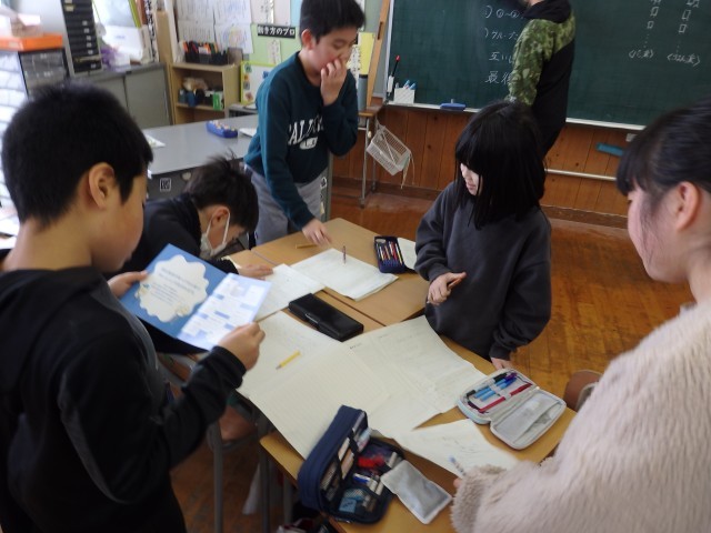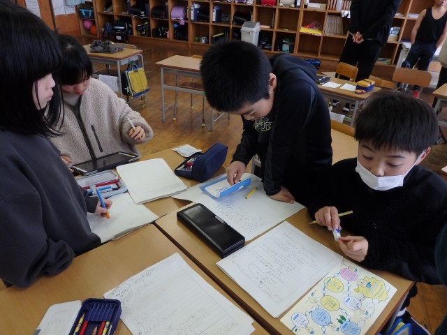 今日は午後からも出張の予定でしたが、変更になりましたので記事をアップします。4年生の4時間目は総合の授業でした。学習発表会以降の学習のまとめです。2学期に校外学習で訪れた八海山あまさけ工場と魚沼の里で学んだことについて、あまさけチーム、魚沼の里チーム、小道具チームの3つに分かれて発表準備をしていました。体調不良でお休みの子もオンラインでチームの話し合いに参加していました。