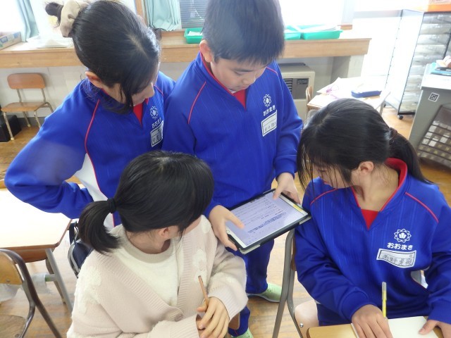 4年生の1時間目は社会の授業でした。「地域で受け継がれてきたもの」の学習です。インターネットで「昔から受け継がれてきた歴史ある建物」について調べ、新聞の形でまとめていました。長谷川邸やもみじ園、六万騎城、坂戸城跡などについて調べていました。