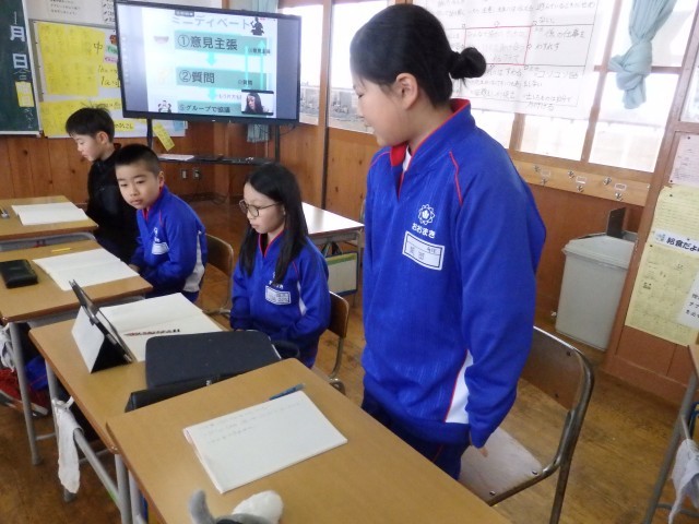 4年生の4時間目は国語の授業でした。ある町のイベント「いちご祭り」の2つのチラシについて、どちらがいいかをディベートで話し合っていました。勝敗を判断するのはオンラインの子も含めた3人の審判員です。「なぜこのチラシがいいのか」をアピールしたり、相手の意見に質問を出したり反論したりします。チームで相談しながら討論を楽しんでいました。