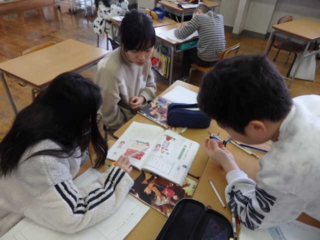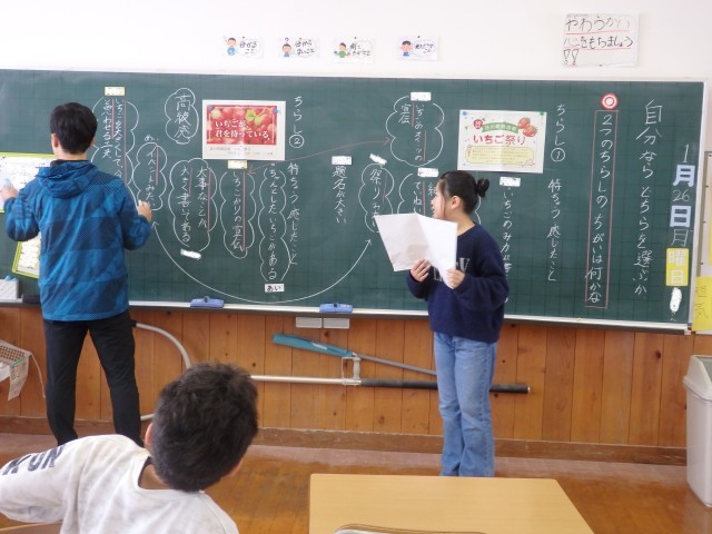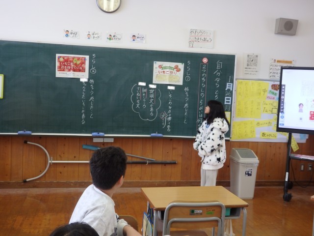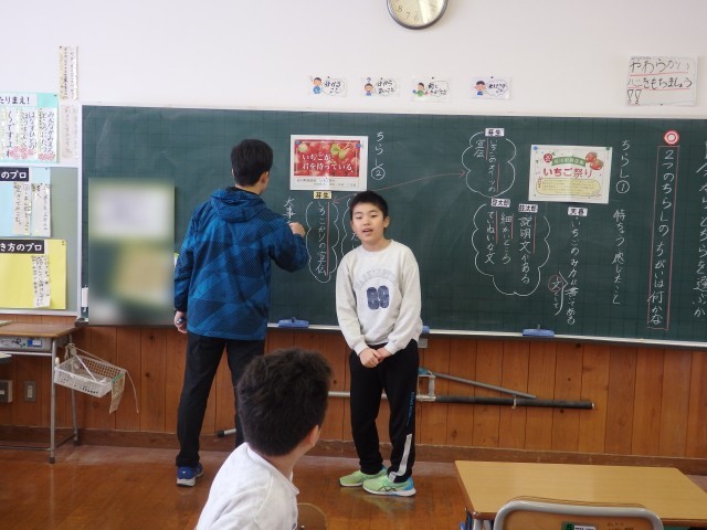 4年生の1時間目は国語の授業でした。ある町の「いちご祭り」についての2種類のチラシを見て、その特徴や気付いたことなどを班で話し合い、発表しました。2つのチラシの「同じところ」「違うところ」についても話し合っていた班がありました。次の時間には「自分はどちらがいいと思うか」という意見文を書くようです。