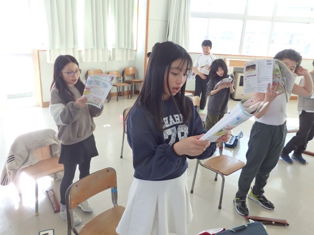 4年生の6時間目は総合の授業でした。3月4日の学習参観を「第2学習発表会」として、総合で学んだことを発表します。発表準備をしていました。2チームに分かれて、シナリオを作る人、スライドを作る人、小道具を作る人と分担して取り組んできました。シナリオが完成したので、誰がどこのセリフを言うのか話し合いました。また、スライド作りの人はできあがったスライドを、シナリオと読み合わせをして先生に確認してもらいました。着々と準備を進めています。