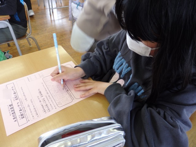 4年生の3,4時間目の学活です。3時間目は、先生が「4年生としてこんな人になってほしい」、「こんなクラスになってほしい」、「これは厳しくします」という想いを子どもたちに伝えたり、子どもたちは「どんなクラス、どんな4年生になりたいか」という願いを考え、発表していきました。「安心できる」「お手本になれる」「先生に言われなくても行動する」など、いい意見がたくさん出されました。4時間目は「4年生になって」というプリントをもとに「得意なこと」「将来の夢」「学習・生活面でのめあて」などを考えました。