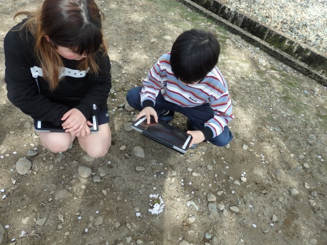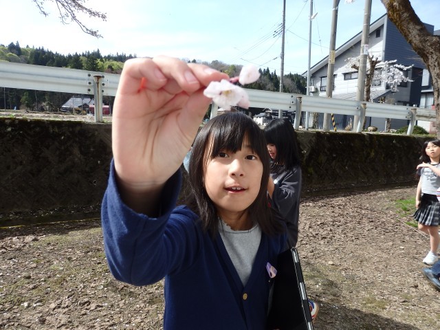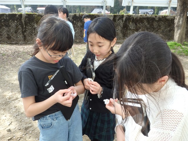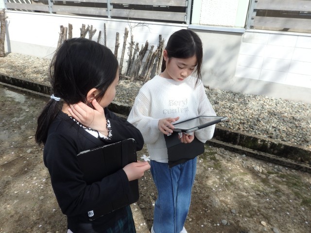 4年生の5時間目は理科の授業でした。体育館脇に咲いている桜の観察をしました。桜の花をiPadで写真に撮ったり、地面に落ちていた花を大事そうに拾ったりしていました。たくさん花を拾った子が、他の子に「分けてあげるよ」とお裾分け。優しいですね。