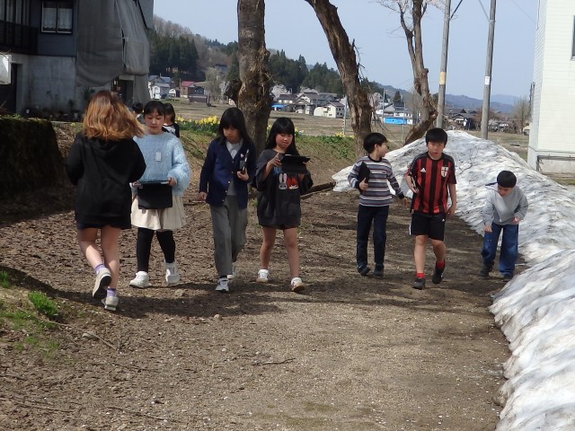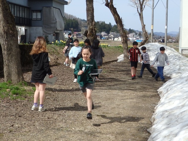 3,4年生の4時間目は合同で体育の授業でした。50m走のタイムを計りました。昨年はグラウンドにまだ雪が積もっていたので、体育館脇の道路で測りましたが、今年は雪解けが早くグラウンドを走ることができました。まずは4年生です。走り終わって先生からタイムを聞き、「やった!」と喜ぶ子がたくさんいました。