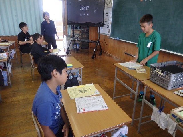 5年生の5時間目は総合の授業でした。学習発表会のシナリオが完成したので、それをもとにして配役を決めました。テーマは「田んぼと米づくり」です。配役が決まったら、同じ役割の人で集まって、誰がどのセリフを言うのかなどを決めました。本番までの練習を協力して取り組んで、5年生らしい発表をしてほしいです。