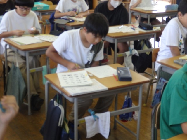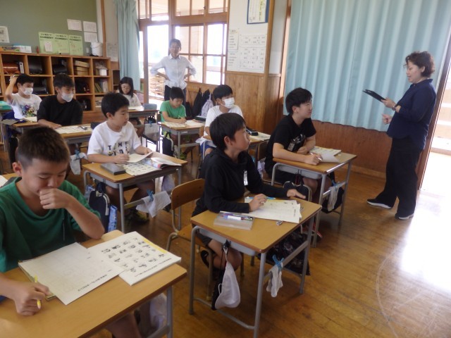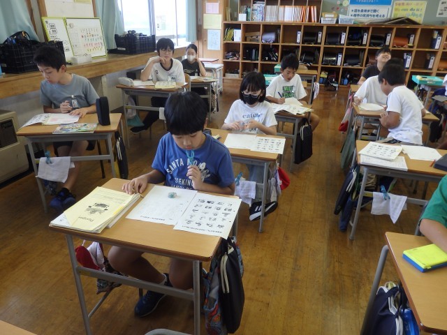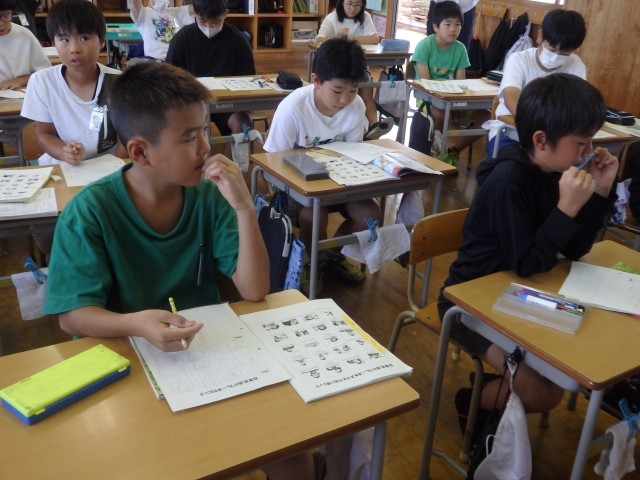 5年生の3時間目は算数の授業でした。「単位量あたりの大きさ」の学習です。「台風の風の速さは秒速25m、自動車の速さは時速54km。どちらが速い?」という問題に取り組んでいました。距離と時間の2つの単位を合わせるために、膨大な数のかけ算や割り算をしなければいけませんが、頑張って取り組んでいました。
