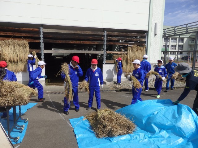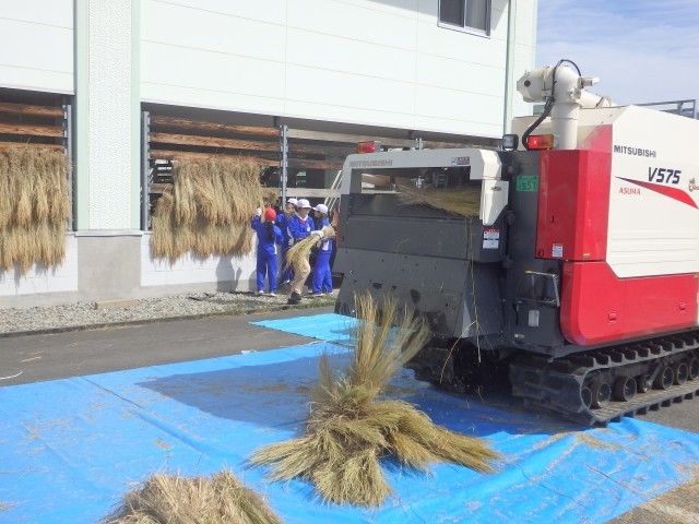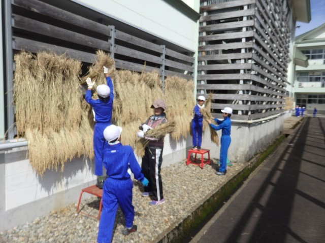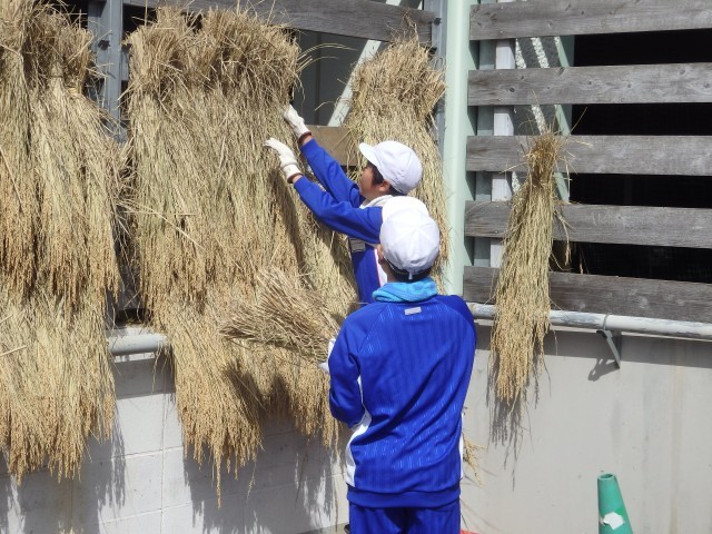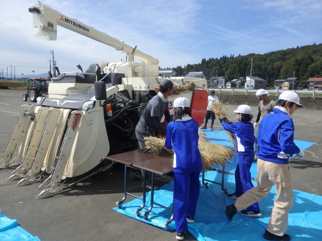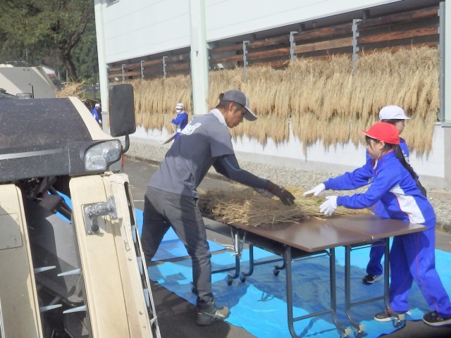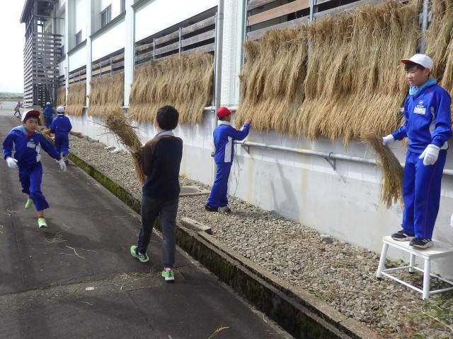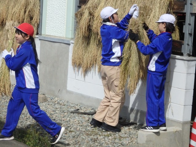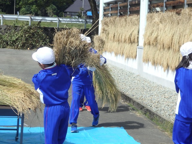 5年生3,4時間目にお米の脱穀作業のお手伝いをしました。地域の方が機械で脱穀してくださるので、子どもたちははざ掛けで干していた稲を機械のところまで運びました。高いところに干してあって届かないときには、背が高い子が変わって取ってあげたりなど、協力して取り組んでいました。