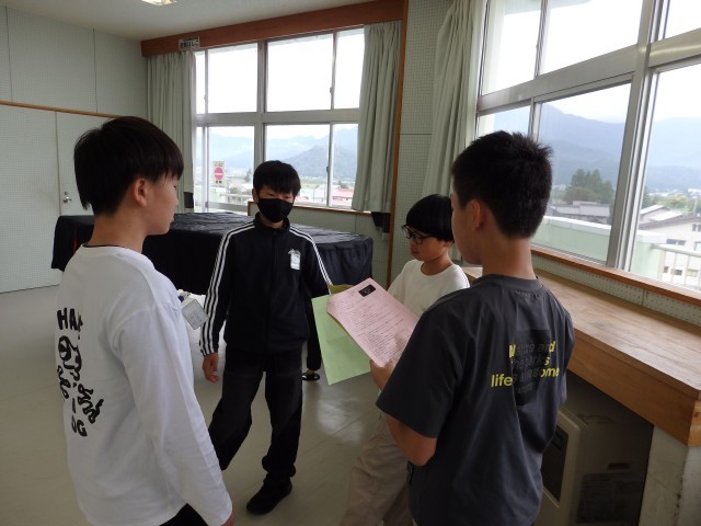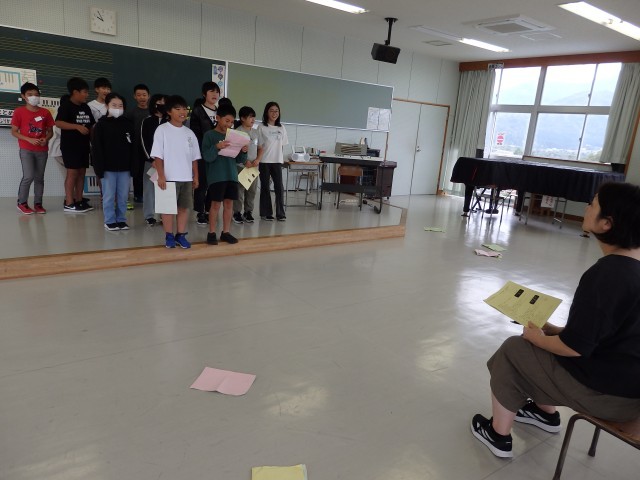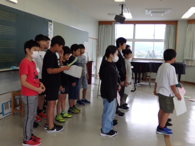 5年生の2時間目は総合の授業でした。学習発表会での発表練習をしていました。ステージでの発表を見越して、音楽室で練習しました。まずは同じ役割の人で集まってセリフの確認をした後、本番どおりの流れで練習しました。もうすっかり自分のセリフを覚えている子が何人もいました。