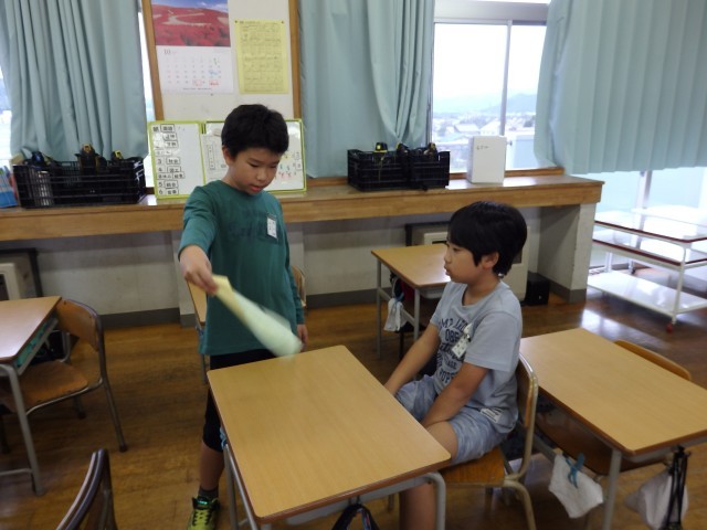 5年生の3時間目は理科の授業でした。先生たち全員が参観する授業として行いました。他校の先生も見に来られていました。「河原の石が上流から下流に行くにしたがってどのように変わっていくのか」を確かめる実験です。水を入れたペットボトルに生け花用のスポンジを入れ、班ごとで1人150回ずつ振ります。さて、石に見立てたスポンジはどのように変わっていったでしょうか。