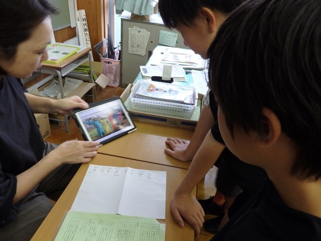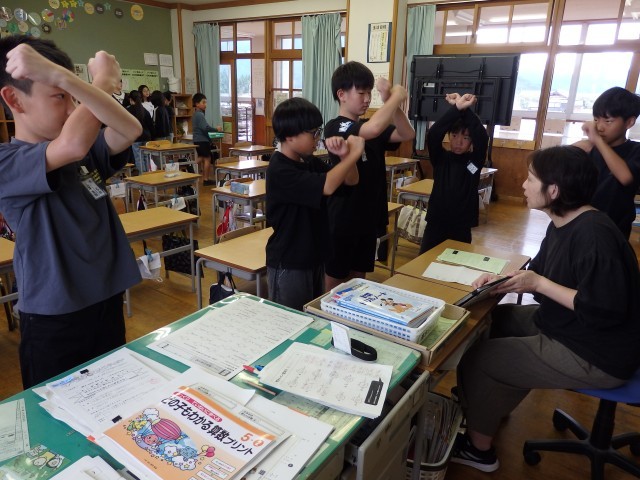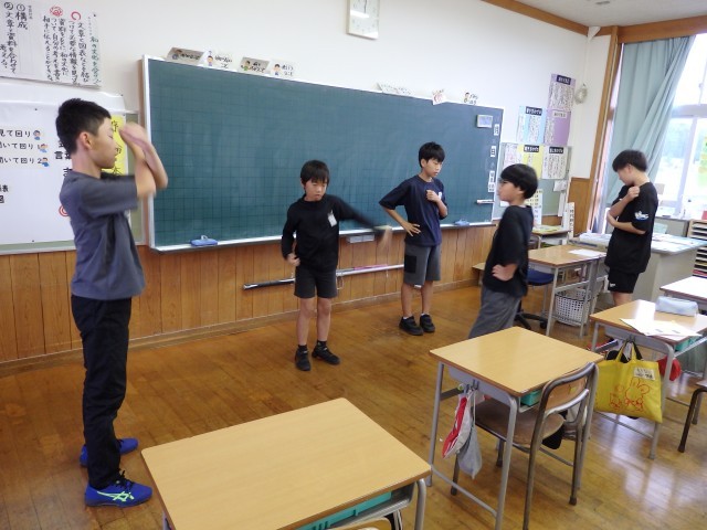 5年生は1時間目に学習発表会の発表練習を行いました。役割ごとに分かれて動きをつけながらセリフを言う練習をしていました。田植えや稲刈りのときにおなじみのあの戦隊の決め台詞を、動画を見ながらたのしそうに練習しているグループがありました。