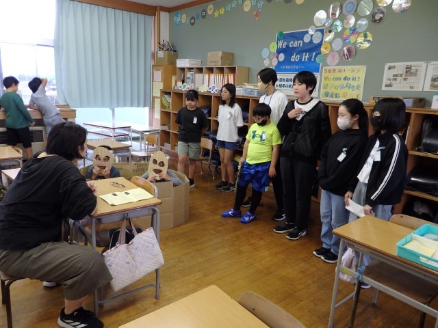 5年生の1時間目は学活の授業でした。学習発表会の準備と練習をしていました。前半は役割分担ごとに集まってセリフを言う練習です。台本を見ないで言えるようになってきました。後半は小道具づくりです。さて、一番最後の写真は何を表しているでしょうか。ご想像にお任せします。