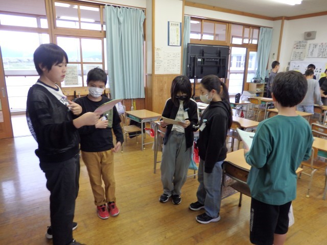 5年生の5時間目は総合の授業でした。学習発表会のシナリオが完成したので、それをもとにして配役を決めました。テーマは「田んぼと米づくり」です。配役が決まったら、同じ役割の人で集まって、誰がどのセリフを言うのかなどを決めました。本番までの練習を協力して取り組んで、5年生らしい発表をしてほしいです。