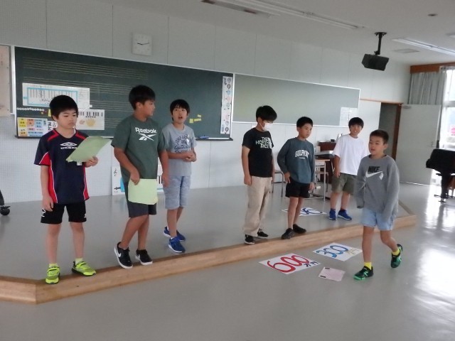 5年生の2時間目は総合の授業でした。学習発表会での発表練習をしていました。ステージでの発表を見越して、音楽室で練習しました。まずは同じ役割の人で集まってセリフの確認をした後、本番どおりの流れで練習しました。もうすっかり自分のセリフを覚えている子が何人もいました。