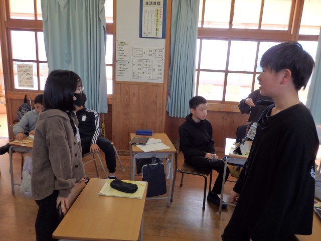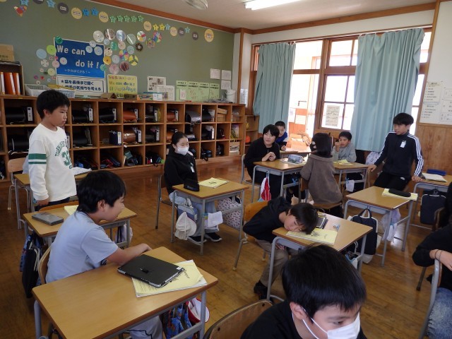 5年生の2時間目は総合の授業でした。学習発表会での発表練習をしていました。ステージでの発表を見越して、音楽室で練習しました。まずは同じ役割の人で集まってセリフの確認をした後、本番どおりの流れで練習しました。もうすっかり自分のセリフを覚えている子が何人もいました。